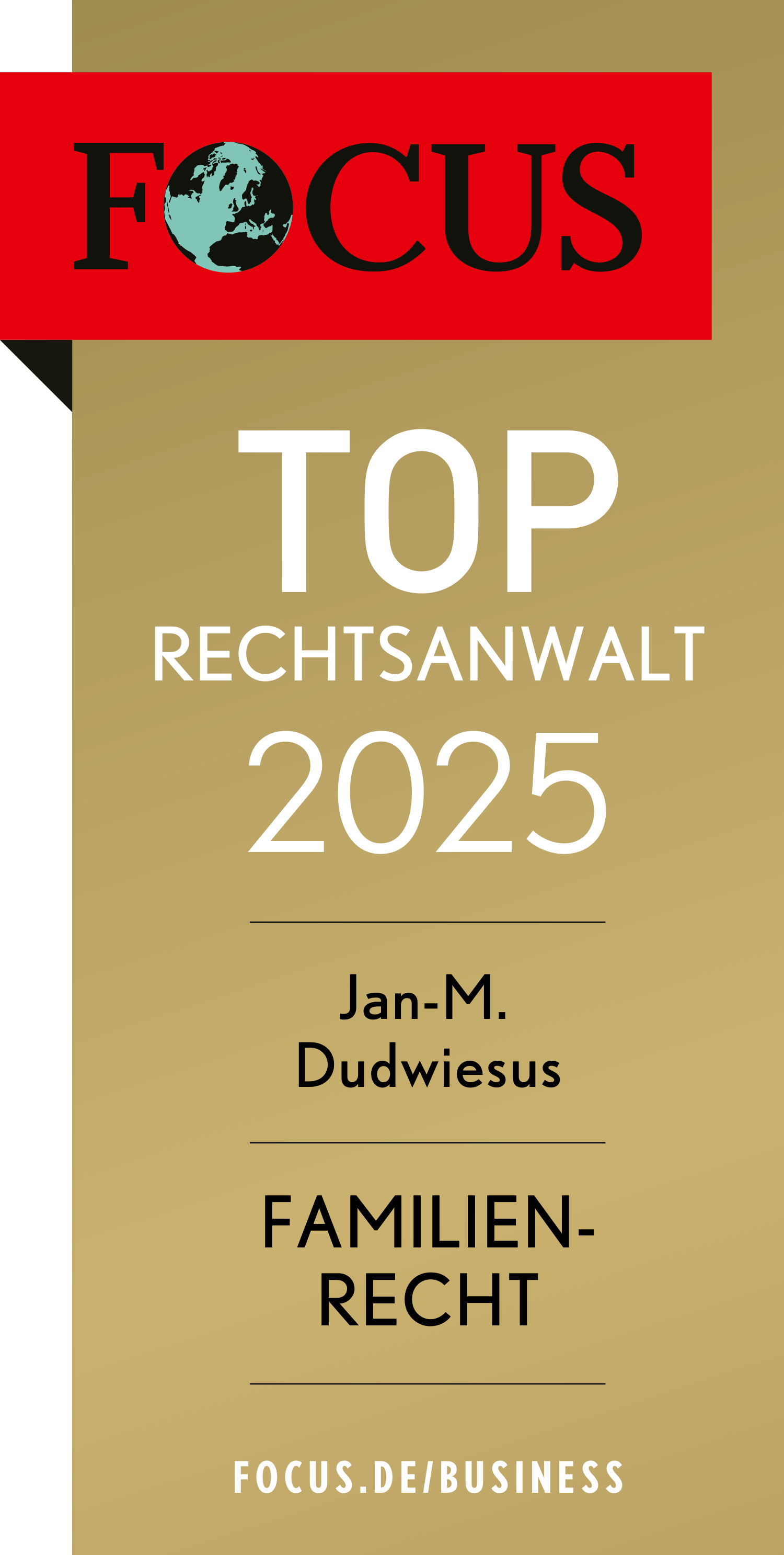Im Jahre 2021, 2022, 2023 und 2024 wurde ich von dem renommierten Nachrichtenmagazin FOCUS in die Liste Deutschlands Topanwälte aufgenommen und im Familienrecht entsprechend empfohlen. *